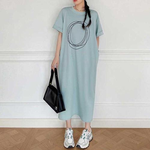 롱 프린팅 원피스 심플 소매 라운드넥 롤업 반팔 WFMFQCQ