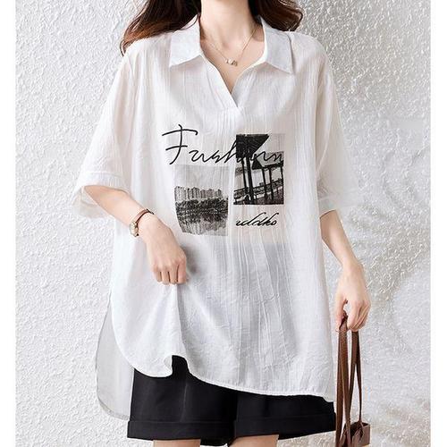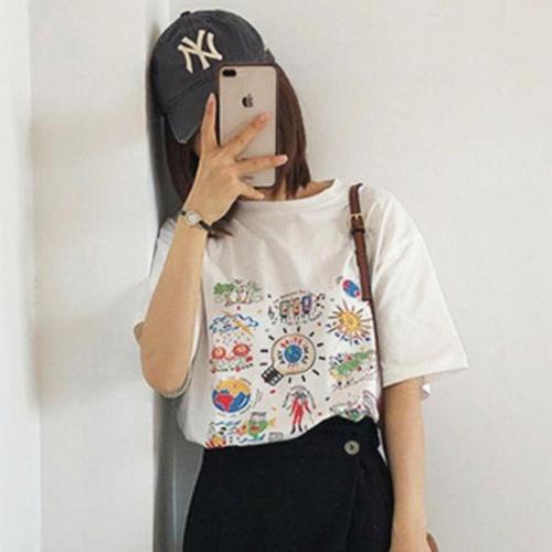 [에이치플러스몰]여성 여름 프린팅 라운드 루즈핏 반팔 흰 티 셔츠
