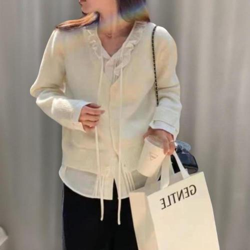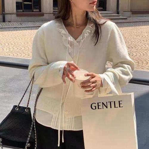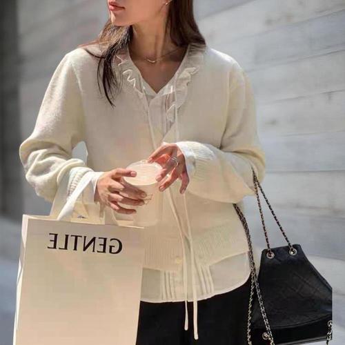[신상오픈런]여성 브이넥 프릴 디테일 니트 가디건 일체형 핀턱 디자인