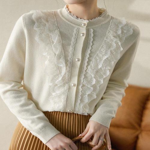 ROYALBELLE 여성 라운드넥 진주버튼 프릴 배색 디테일 레이스 트리밍 우아한 크롭핏 긴팔 가디건 A0062439
