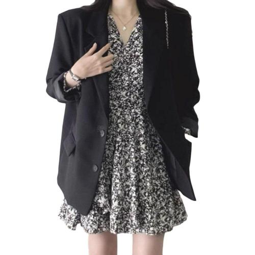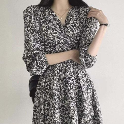 루어스룸 웨스턴 도트 가을 플라워 나염 브이넥 소매 볼륨 셔링 간절기 긴팔 랩 원피스(블랙)