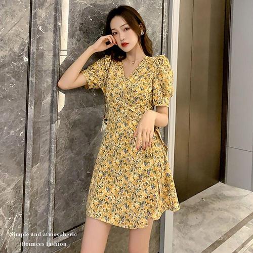 [오너클랜]인기상품 플라워 패턴 미니 원피스 셔링 퍼프 A라인 랩원피스 [W8EE367_260410]