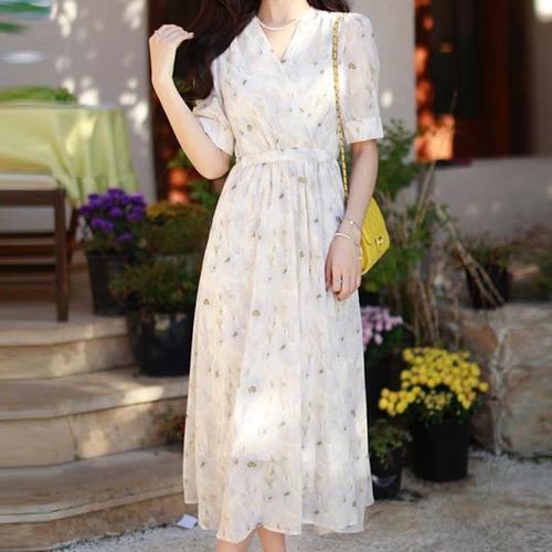 플라워 쉬폰 원피스 여성 꽃무늬 퍼프 드레스 여성원피스 여름휴가원피스 비치원피스