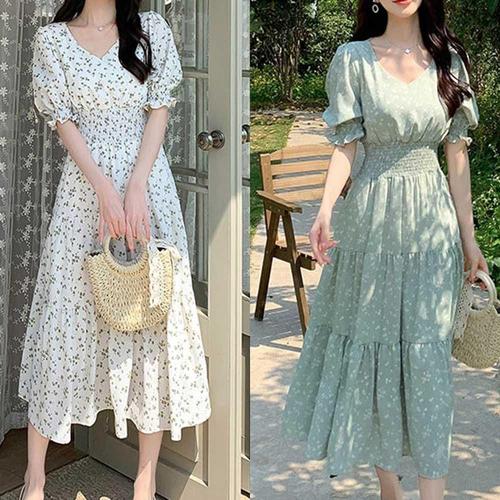 플라워 원피스 쉬폰 퍼프소매 A라인 캉캉 스모크밴딩 WEC46D7