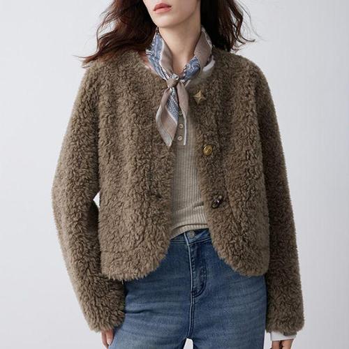 겨울 두꺼운 플러시 버튼 여성 코트 시크 레트로 따뜻한 아우터 캐주얼 출퇴근 스타일 긴 소매 스탠드 칼라 재킷