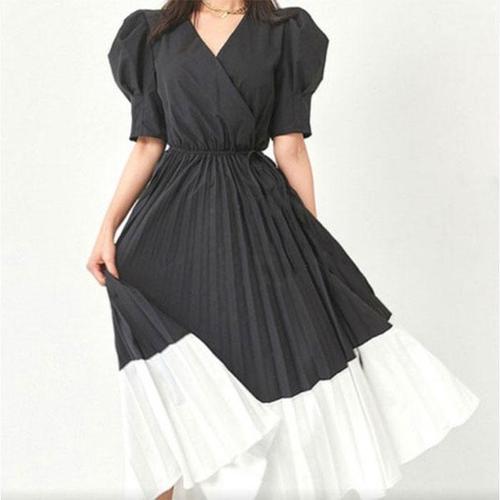 [바이어스]퍼프 반팔 랩 주름 플레어 배색 롱 원피스 코디 룩 (10206337A)