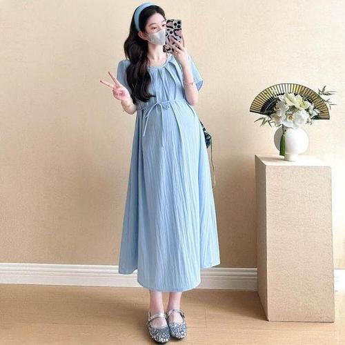 [옷자락]여자 여름 휴양지룩 리본 플리츠 퍼프반팔 롱원피스