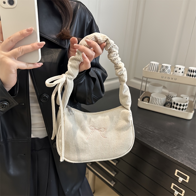 TEMU 여성용 코듀로이 싱글숄더 핸드백 - 리본 장식 & 조절 가능한 스트랩, 크로스바디/숄더백, 지퍼 클로저, 부드러운 코듀로이 외부 & 폴리에스터 안감, 일상 및 파티용 - 우아한 가방