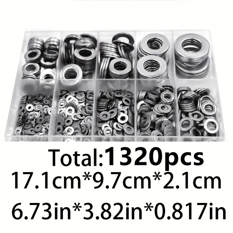 TEMU 304 스테인리스 스틸 재질의 납작한 와셔 1320개 세트 (사이즈 M2, M2.5, M3, M4, M5, M6, M8, M10, M12). 가정 장식, 수리, 주방, 상점 및 야외 건설에 적합한 다양한 사이즈의 와셔 키트