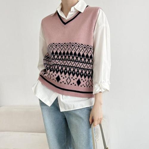 여성 브이넥 국산 패턴 니트 조끼 21DS-WVS-2170-핑크