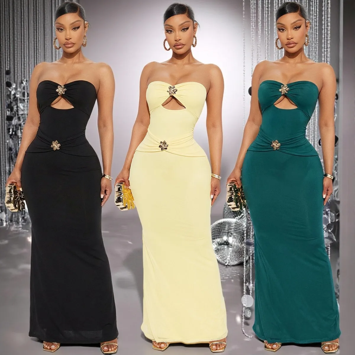 스트랩리스 홀터넥 맥시 드레스 2026 봄/여름 섹시 메탈릭 플라워 바디콘 이브닝 가운 여성 파티 웨딩 칵테일 드레스