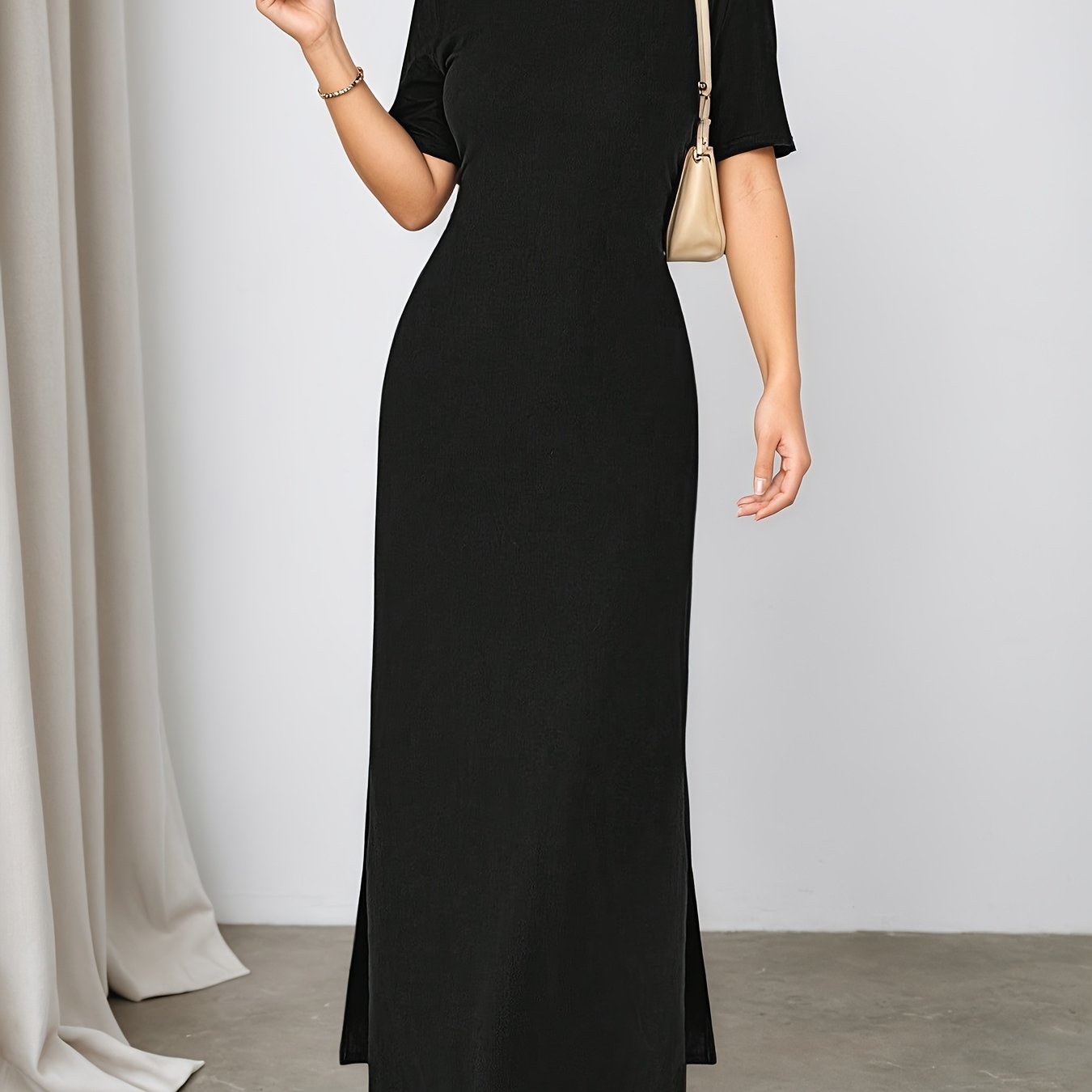 TEMU 여성용 우아한 슬림핏 맥시 드레스 - 반팔 라운드넥 - 슬릿 헴 롱 드레스, 봄 여름 가을용 솔리드 컬러, 세탁기 사용 가능 파티 웨딩 게스트 가운, 속옷 없음, 합리적인 가격의 캐주얼 의상