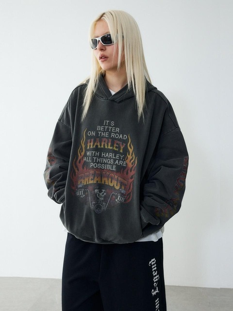 [할리데이비슨 컬렉션스] [빈티지] 스컬 플레임 피그먼트 다잉 오버핏 후디_챠콜 HH16109004