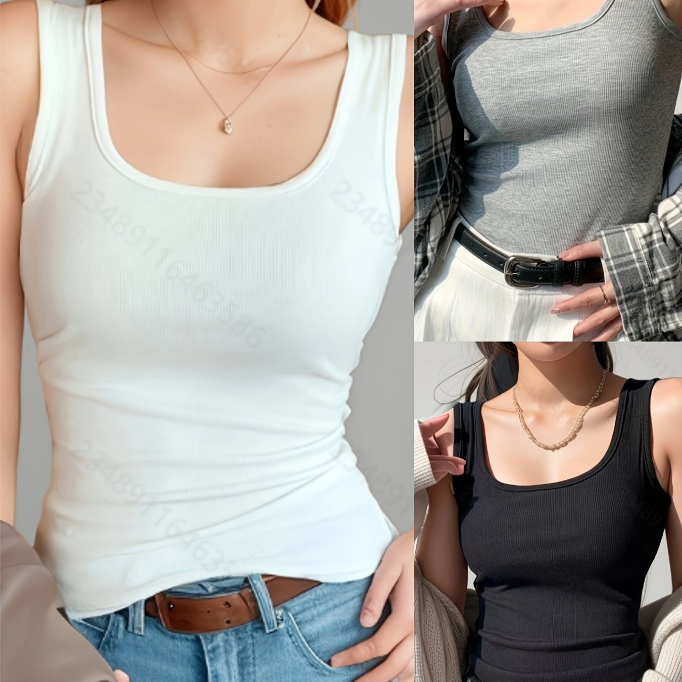 TEMU 여성용 골지 탑 3종 세트, 스퀘어넥 단색 탑, 클래식 기본형 민소매 셔츠, 우아하고 심플, 캐주얼, 야외 활동에 적합, 트렌디한 의류.|블라우스|나시티|여성의류