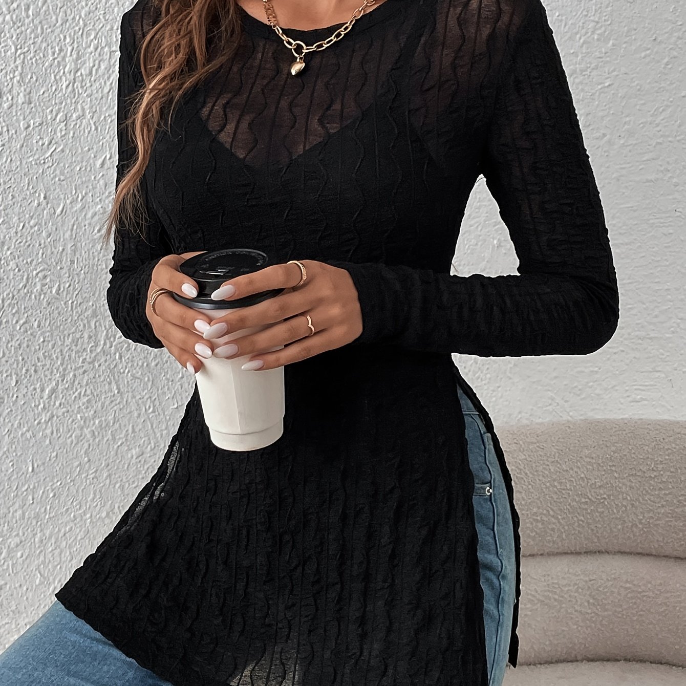 TEMU 여성용 우아한 시스루 슬릿 오버사이즈 티셔츠 - 슬림핏 롱 탑, 가을/겨울 레이어링에 적합, 드레시 캐주얼 웨어 - 세탁기 및 드라이클리닝 가능