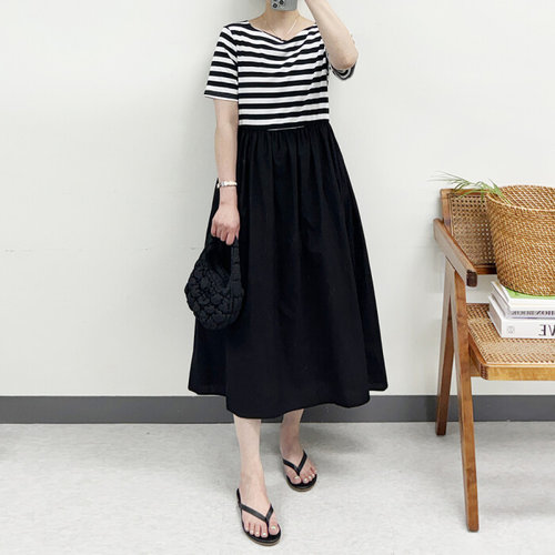 미즈큐즈 / 햅번 벌룬 플레어 허리 밴딩 스트라이프 반팔 롱원피