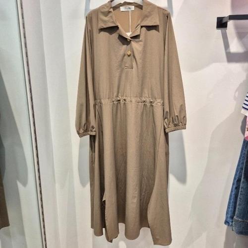 [옷자락] 여성용 심플 허리 스트링 카라 반팔 롱 셔츠 원피스