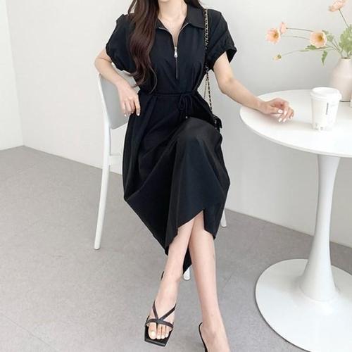 [옷자락]여성용 심플 허리 스트링 카라 반팔 롱 셔츠 원피스