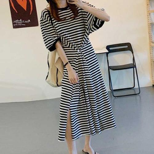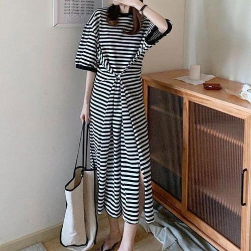 [오너클랜]인기상품 스트라이프 허리조임 반팔 롱원피스 여유핏 밑트임 [WAE65A4_250919]