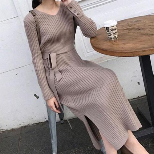 ORZQU봄 미디스커트 허리 트임 긴팔 니트 원피스