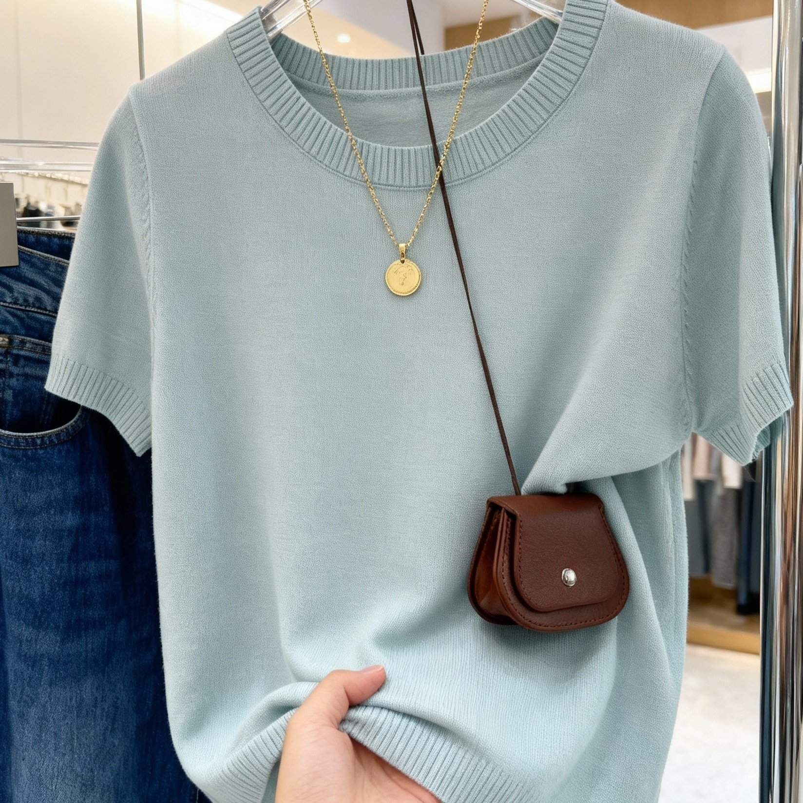 TEMU 라이트 블루 반팔 셔츠, 한국 스타일의 부드러운 감성, 쉬운 스타일, 상의, 고탄력 원단, 부드럽고 피부 친화적, 통기성 좋고 답답하지 않음, 클래식 라운드넥 디자인, 목선 수정, 얼굴을 더 작게 보이게 함