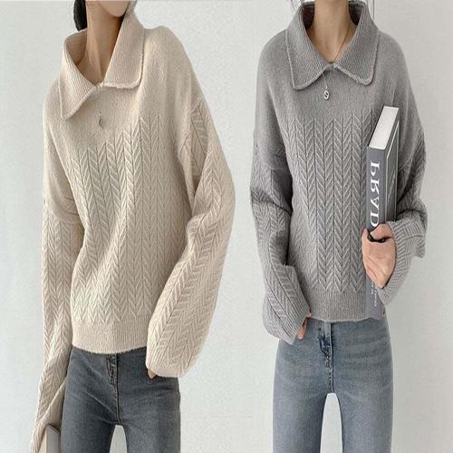 [셀럽하우스]여자 ZSKG6147 헤링본 패턴 카라 세미크롭 니트 스웨터 루즈핏
