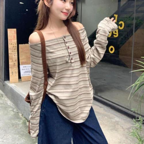 [오너클랜]인기상품 긴팔티셔츠 보트넥 루즈핏 스트라이프 오프숄더 긴팔 [WFK7HML_260406]