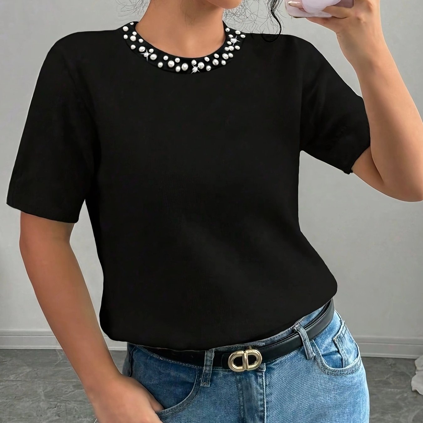 TEMU 여성용 패션 네크라인 진주 장식 캐주얼 티셔츠