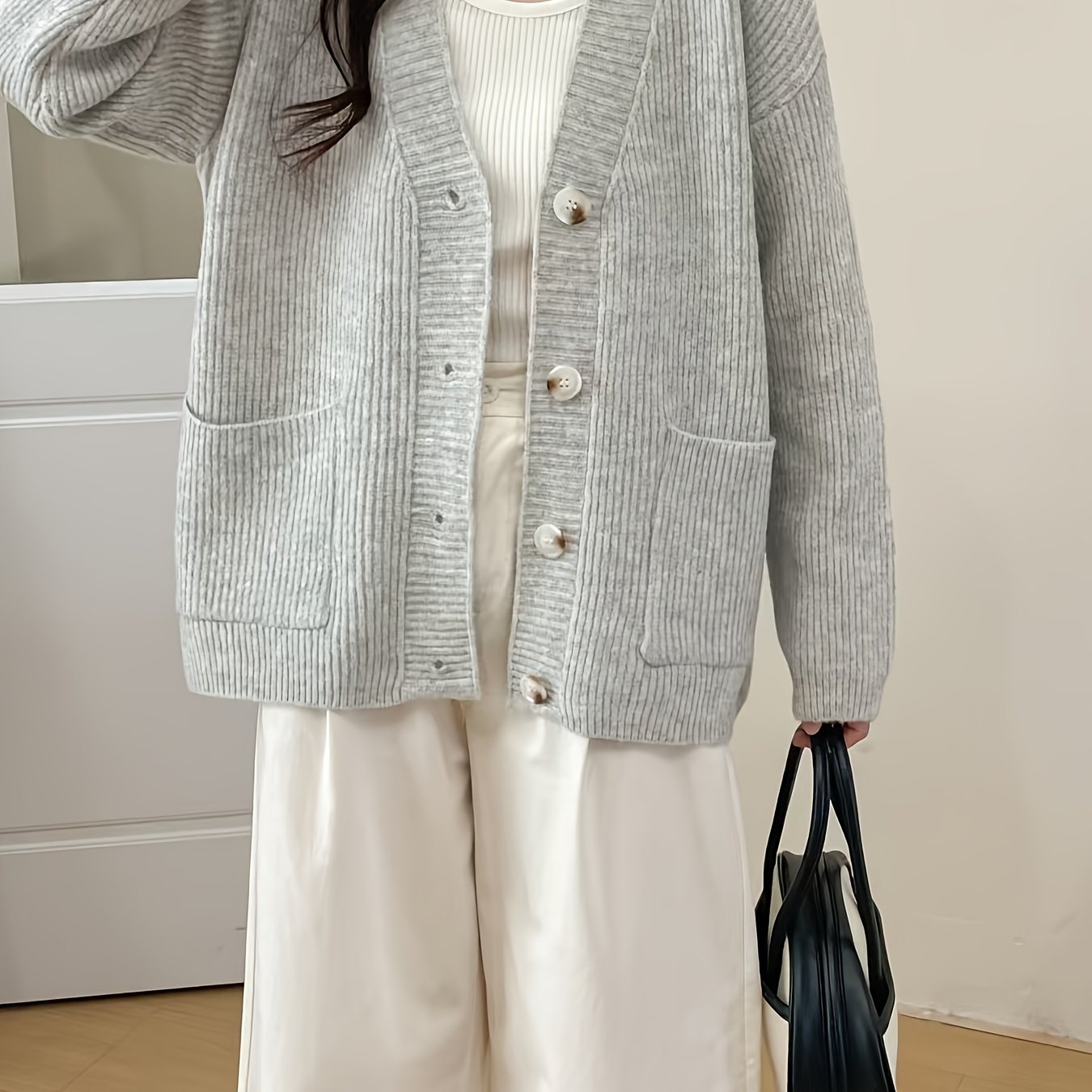 TEMU 여성용 그레이 V넥 케이블 카디건 - 가을 겨울용 우아한 루즈핏 버튼 프론트 스웨터, 세탁기 사용 가능 편안한 레이어링 아이템, 소녀스러운 니트웨어, 캐주얼 윈터 웨어|가디건