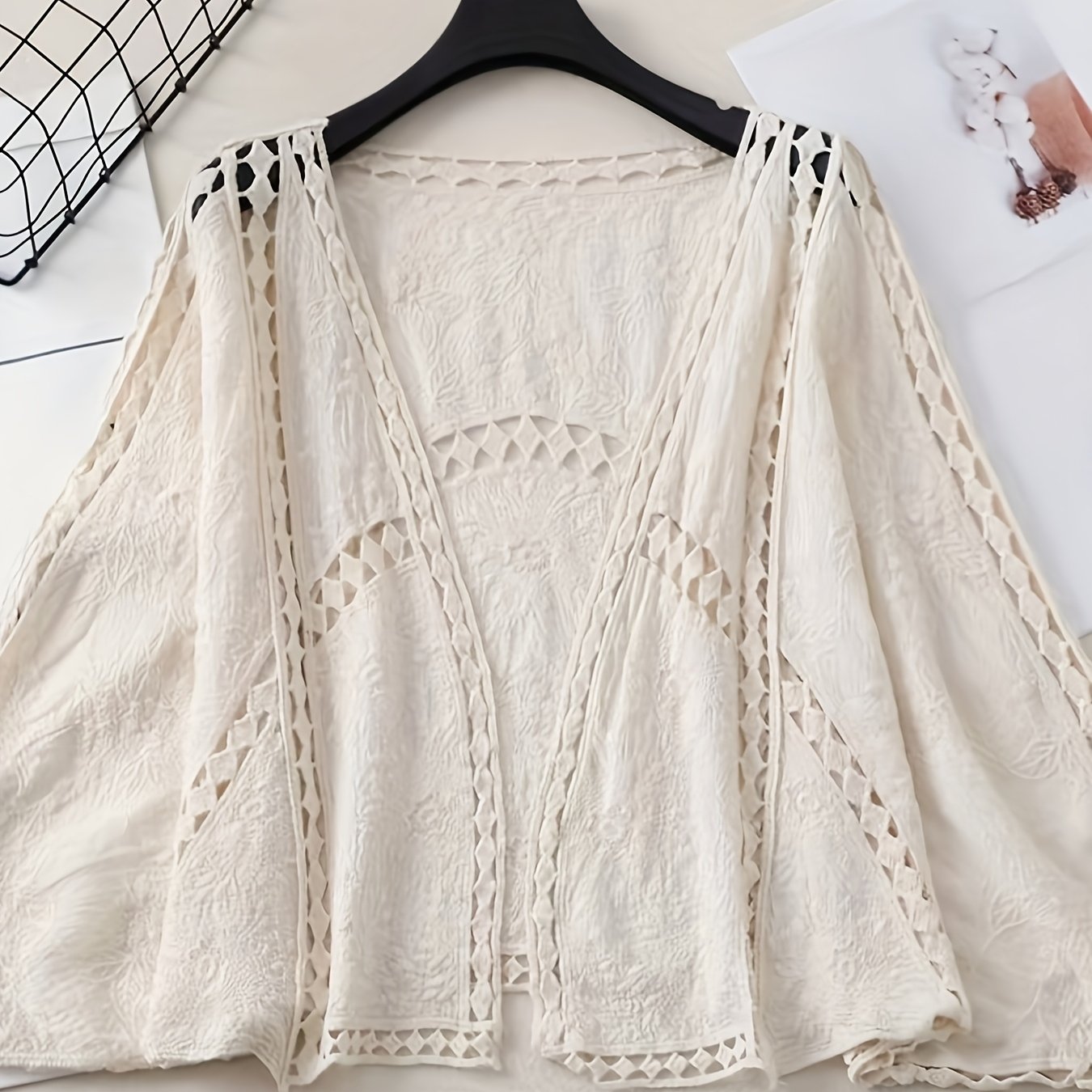 TEMU 스타일 홀아웃 크로셰 자수 V넥 삼분의 일 소매 얇은 가디건 탑