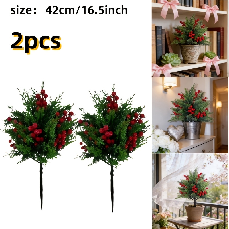 TEMU 2개 인조 소형 사이프러스 식물 - 레드 베리 장식과 포함, 사이프러스/소나무 모양 관목, 사무실 장식, 실내/야외 홈 데코, 이벤트 플래닝 장식용