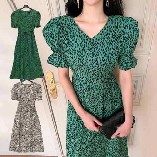TBZ 우아한 레오파드 호피무늬 브이넥 반팔 여성 원피스 WFMFHTQ