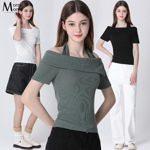 유럽과 미국 여성의 봄 여름 패션 섹시한 오픈 보우 홀터넥 넥 쇼트