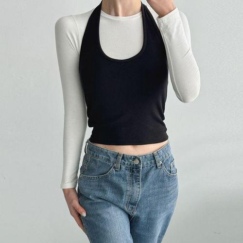 [옷자락]여성 슬림핏 크롭 홀터넥 긴팔 티셔츠