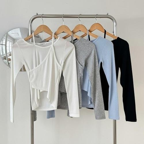 [신상오픈런]|CSTA301|여성 언발란스 레이어드 홀터넥 스판 크로스 긴팔 티셔츠_24746545_597559