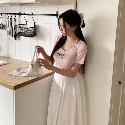 [옷자락]여성 독특한 홀터넥 레터링 자수 일상 반팔 티셔츠