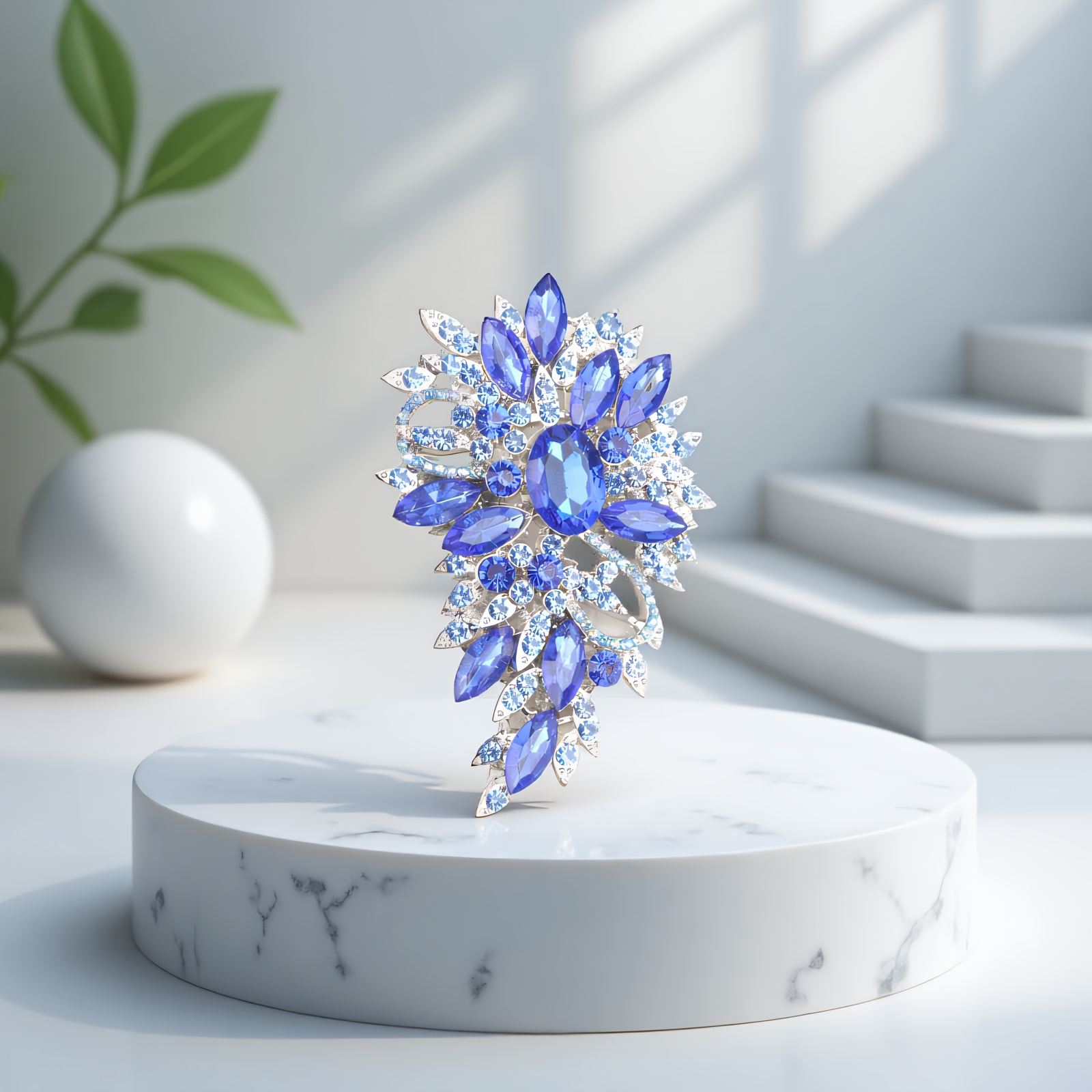TEMU 1개 블루 플로럴 브로치, 반짝이는 라인스톤 & 실버 메탈, 갈라/볼룸 이벤트에 이상적, 패션 주얼리 액세서리, 고급스러운 플로럴 - 영감을 받은 핀, 새틴 이브닝 가운/샴페인에 어울리는 컬러드 샤울