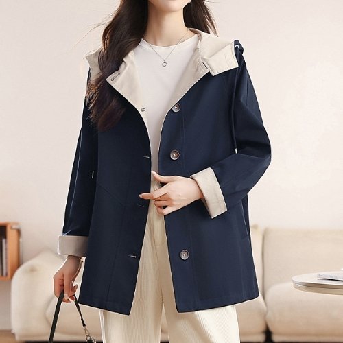 봄 가을 중년 여성 후드 트렌치코트 중간 길이 버전 여성 윈드브레이커 아우터