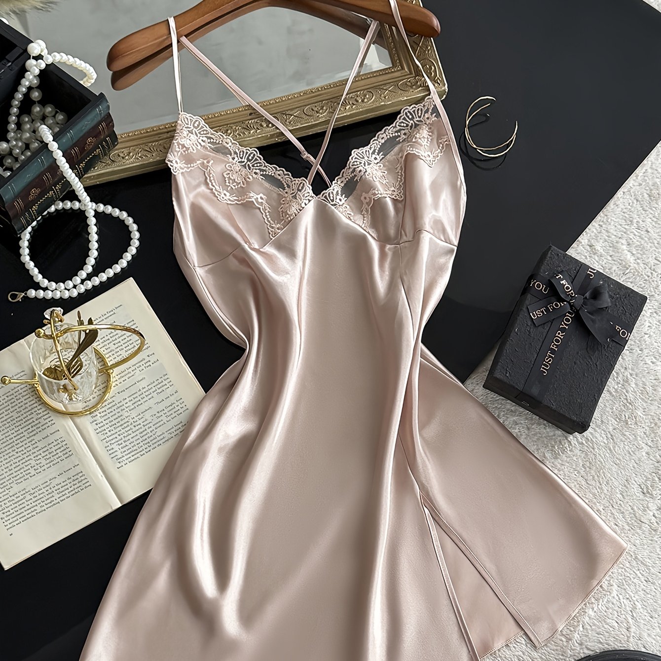 TEMU 우아한 로맨틱 V넥 레이스 장식 슬립 드레스 | 단색, 섹시 스타일, 성인용으로 완벽, 사계절 내내 편안함
