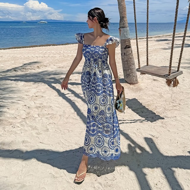 쁘띠엘라 휴양지 원피스 스모크밴딩 A라인 발목기장 빅사이즈 비치웨어