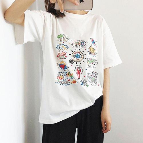 여성 여름 프린팅 라운드 루즈핏 반팔 흰 티 셔츠 WEED22E