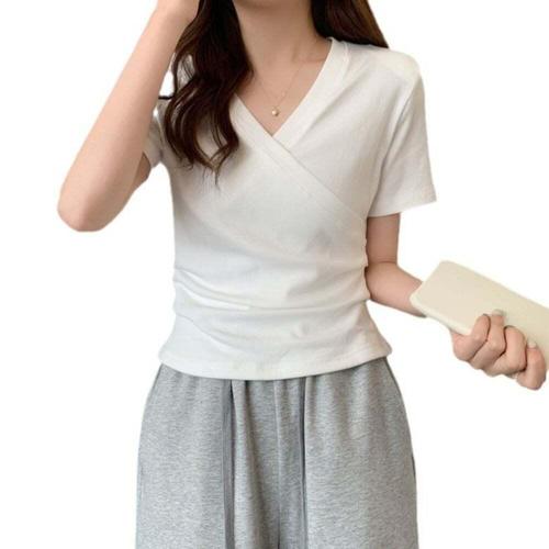 폴리에스터 여름 반팔티 여성 브이넥 슬림 흰 검정 기본 티셔츠 ODM-WMSLV7