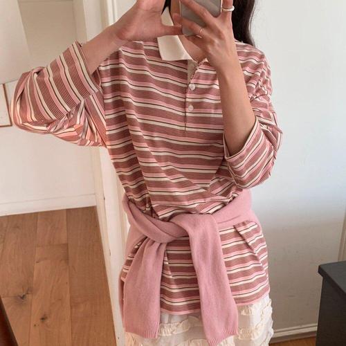 [옷자락]여자 루즈핏 쭉티 힙커버 스트라이프 배색 카라 티셔츠