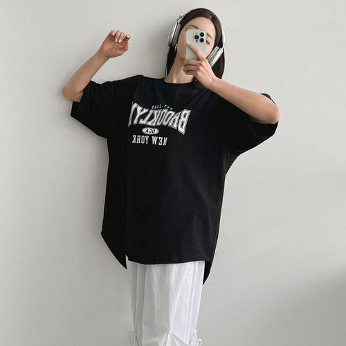 [미라클세븐]여성 오버사이즈 반팔 프린트 언발란스 힙커버 여름 면 티셔츠
