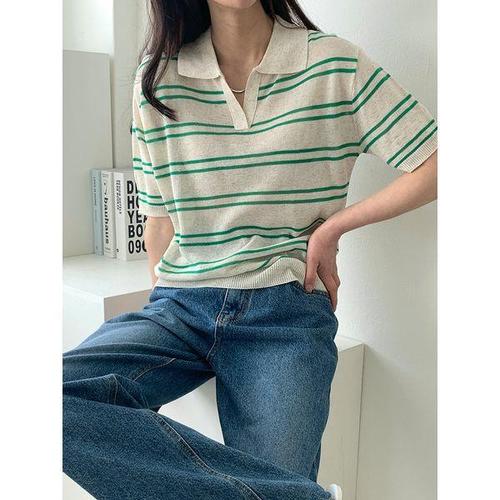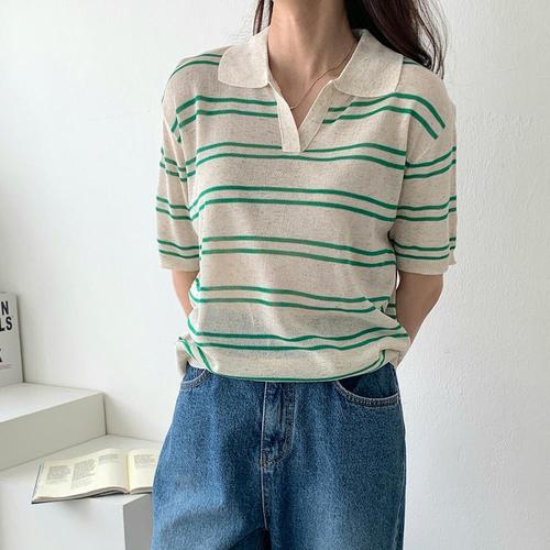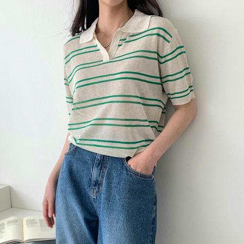[다잇템]여자 카라넥반팔 줄무늬 SS 페미닌 골지 니트_3