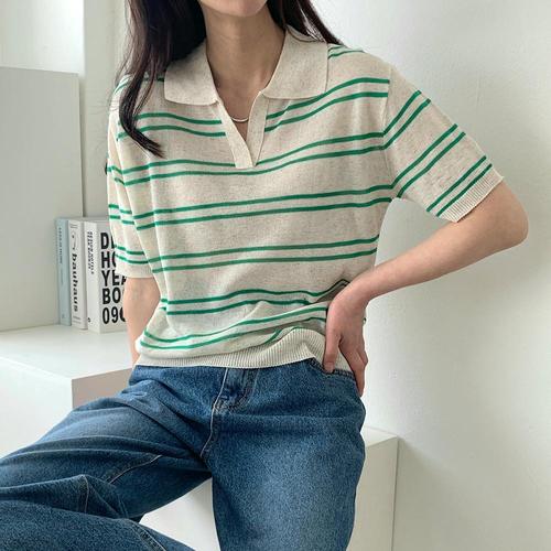 [샵앤]국산 여성 슬릿 카라넥 단가라 반팔 니트 티셔츠 21DS-WKN-4448-그린