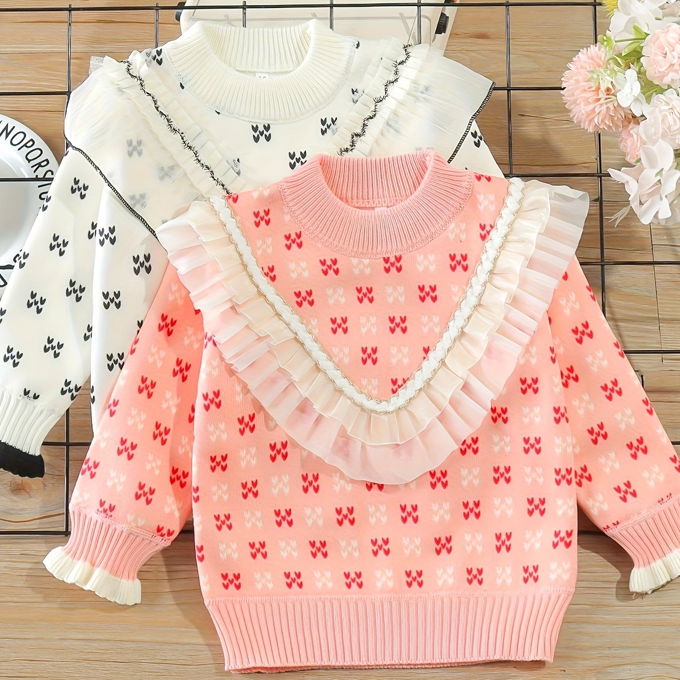 TEMU 2개 여아 스웨터 세트 - 소프트 핑크 & 러플 칼라 겨울 스웨터, 포근한 기모 안감 긴팔 상의 (가을/겨울), 데일리 & 포멀룩 - 완벽한 여아용 스웨터, 시즌 의류, 우아한 디자인, 스타일리시 니트