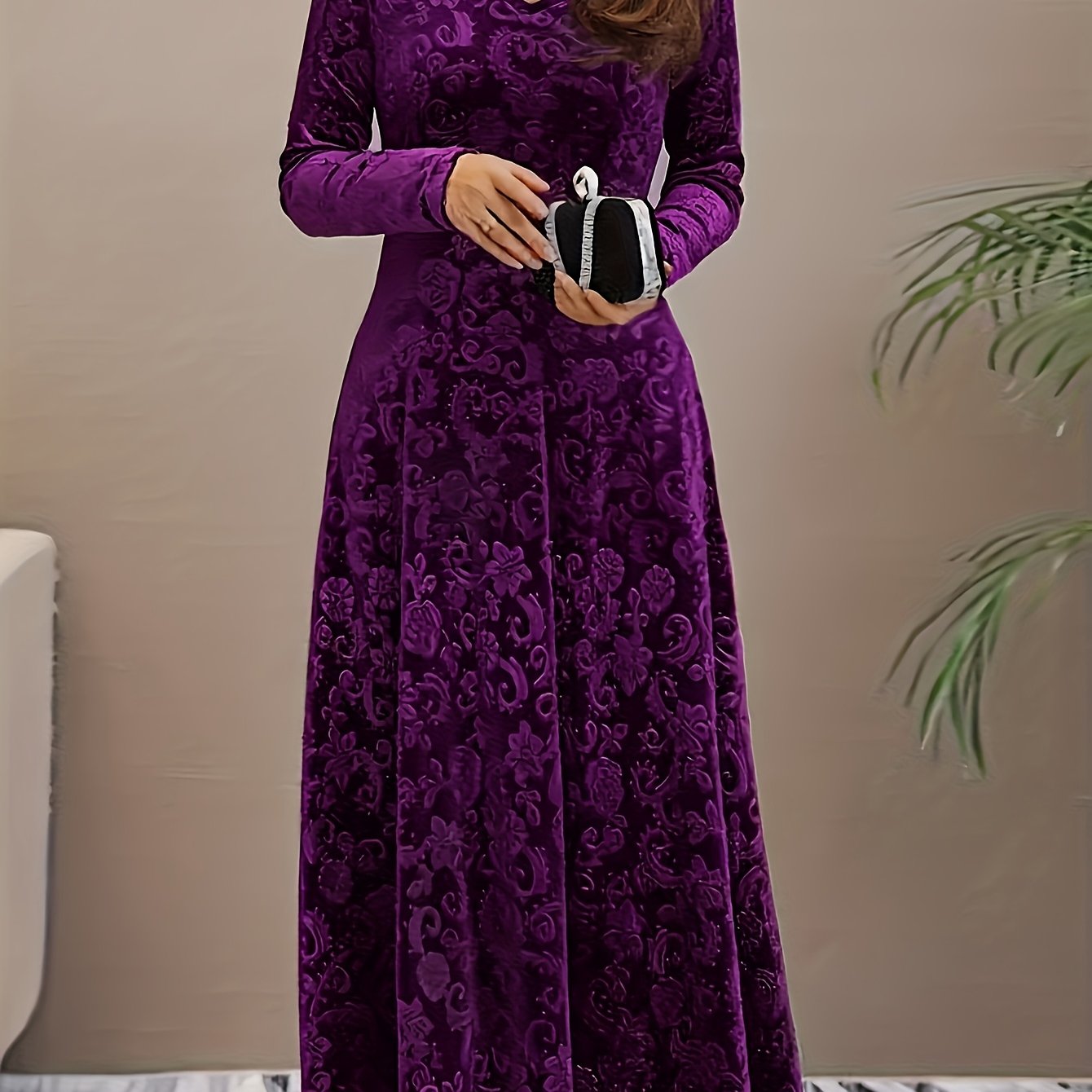 TEMU 1개 우아한 V넥 긴팔 벨벳 드레스 여성용, 폴리에스테르 95% 엘라스테인 5%, 단색, 중간 신축성, 가을/겨울 핏 앤 플레어 니트 원단 이브닝 가운