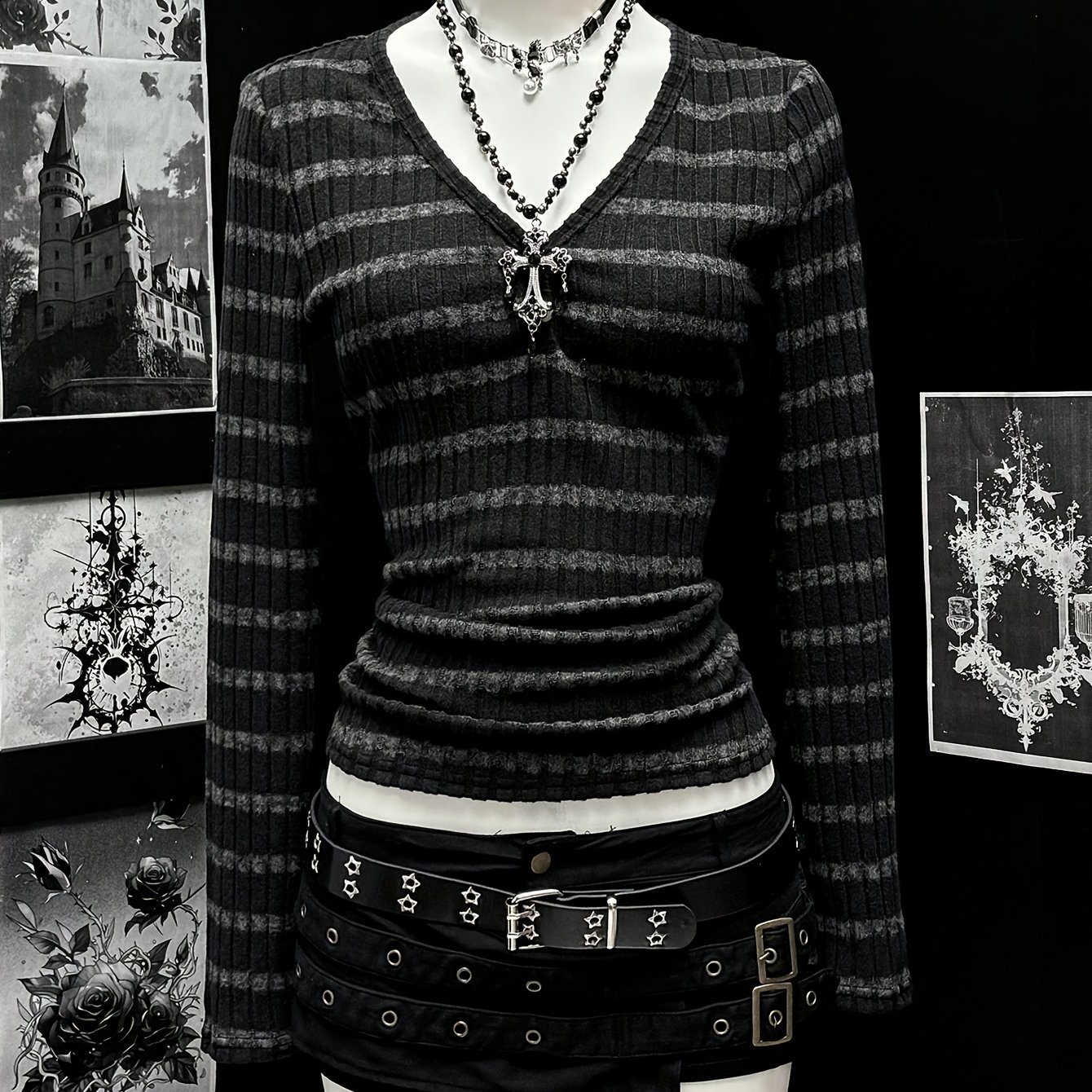 TEMU 여성용 Y2K 고딕 V넥 슬림핏 롱라인 티셔츠 - 블랙 & 그레이 탑, 사계절 착용 가능한 세탁기 사용 가능 블라우스 (논-)