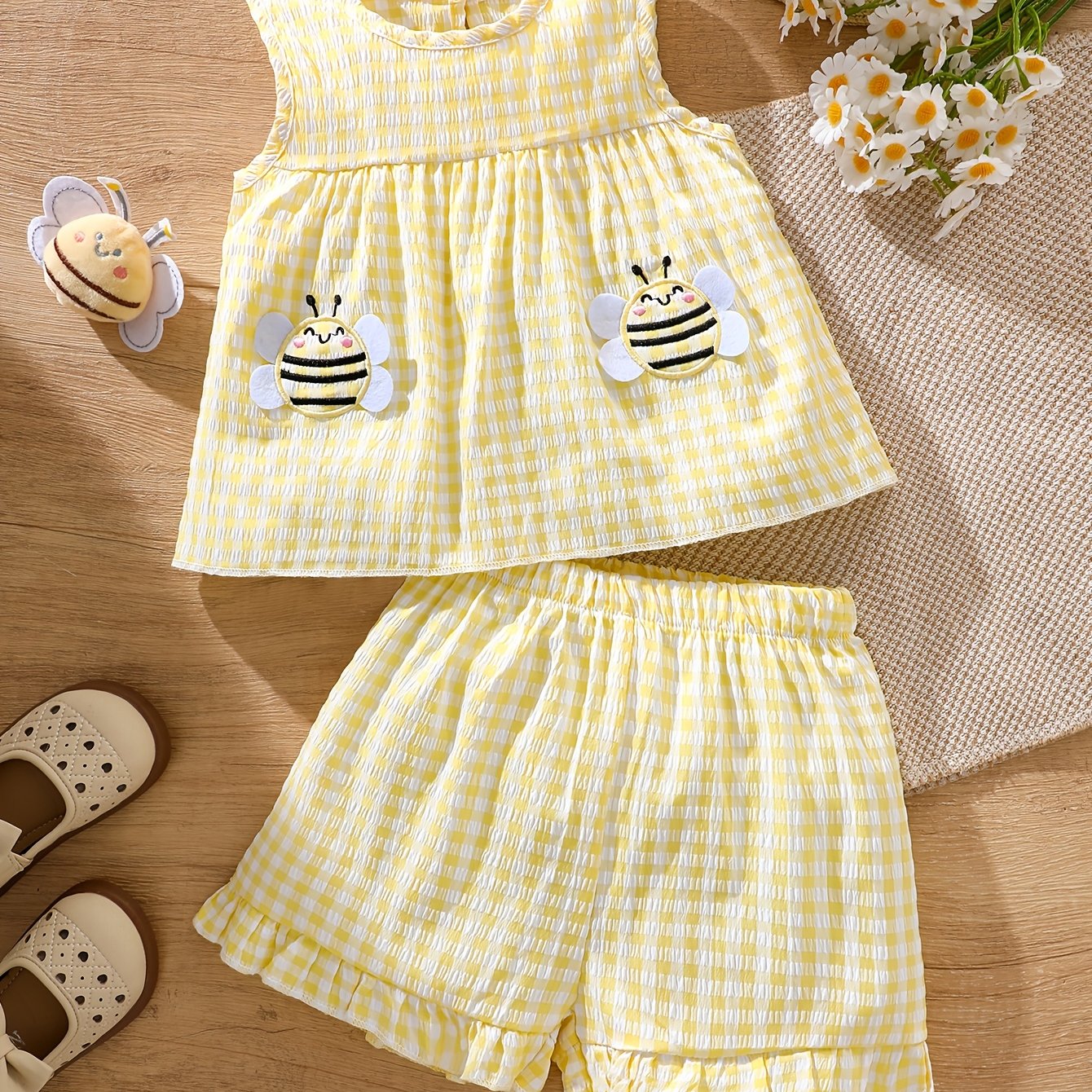TEMU 2개 세트 여아 패션 쇼츠, 라운드넥 민소매 벌 자수 탑 + 체크무늬 패치워크 레이스 쇼츠, 신선하고 트렌디한 민소매 쇼츠 스위트 세트, 귀엽고 상쾌한 베이비 여름 의상, 야외 활동에 완벽